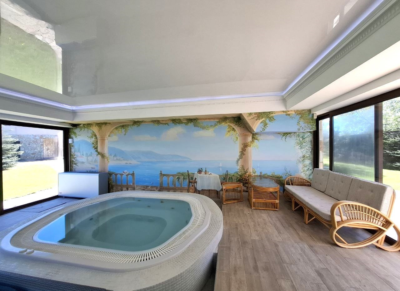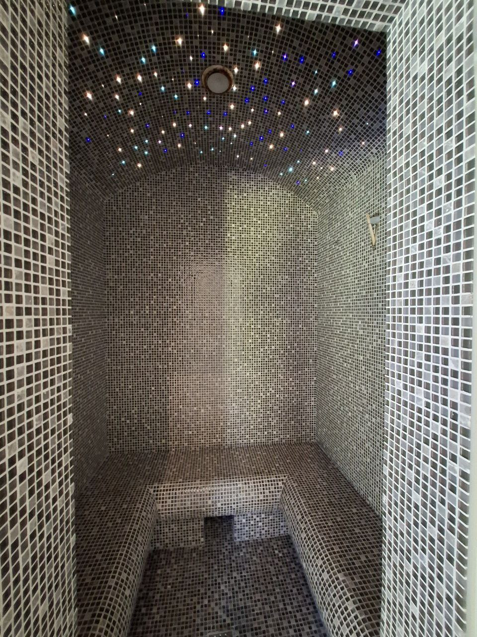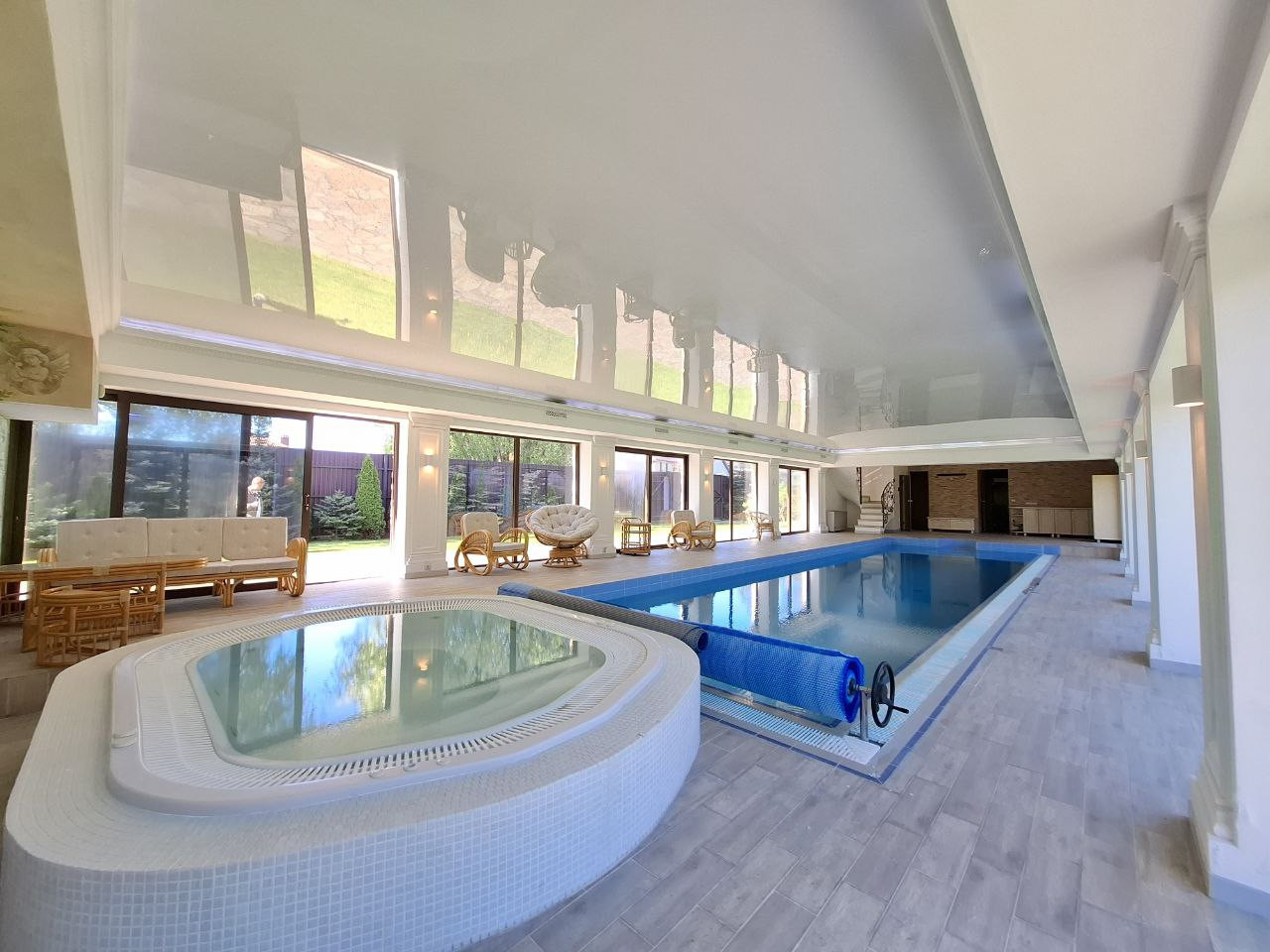 ● Зона спа. Концепция и дизайн отдельно стоящей 2-х этажной зоны отдыха и русской бани была разработана Архитектурным бюро по индивидуальному проекту и заслуживает отдельного внимания: общая площадь 301.2 кв.м, чаша бассейна площадью 65 кв.м. с двойным противотоком и конечно джакузи. Визуальный образ помещения и работа с освещением – первое, что бросается в глаза. Комплекс СПА-процедур не выходя из дома — отнюдь не триумф формы над содержанием, ведь она настолько же функциональна насколько красива. Дать телу отдохнуть и прогреться изнутри можно в жаркой бане или густом паре хаммама. А если надо освежить все чувства разом, мало что сравнится с душем впечатлений. За качеством и температурой воды в бассейне непрерывно следят ...