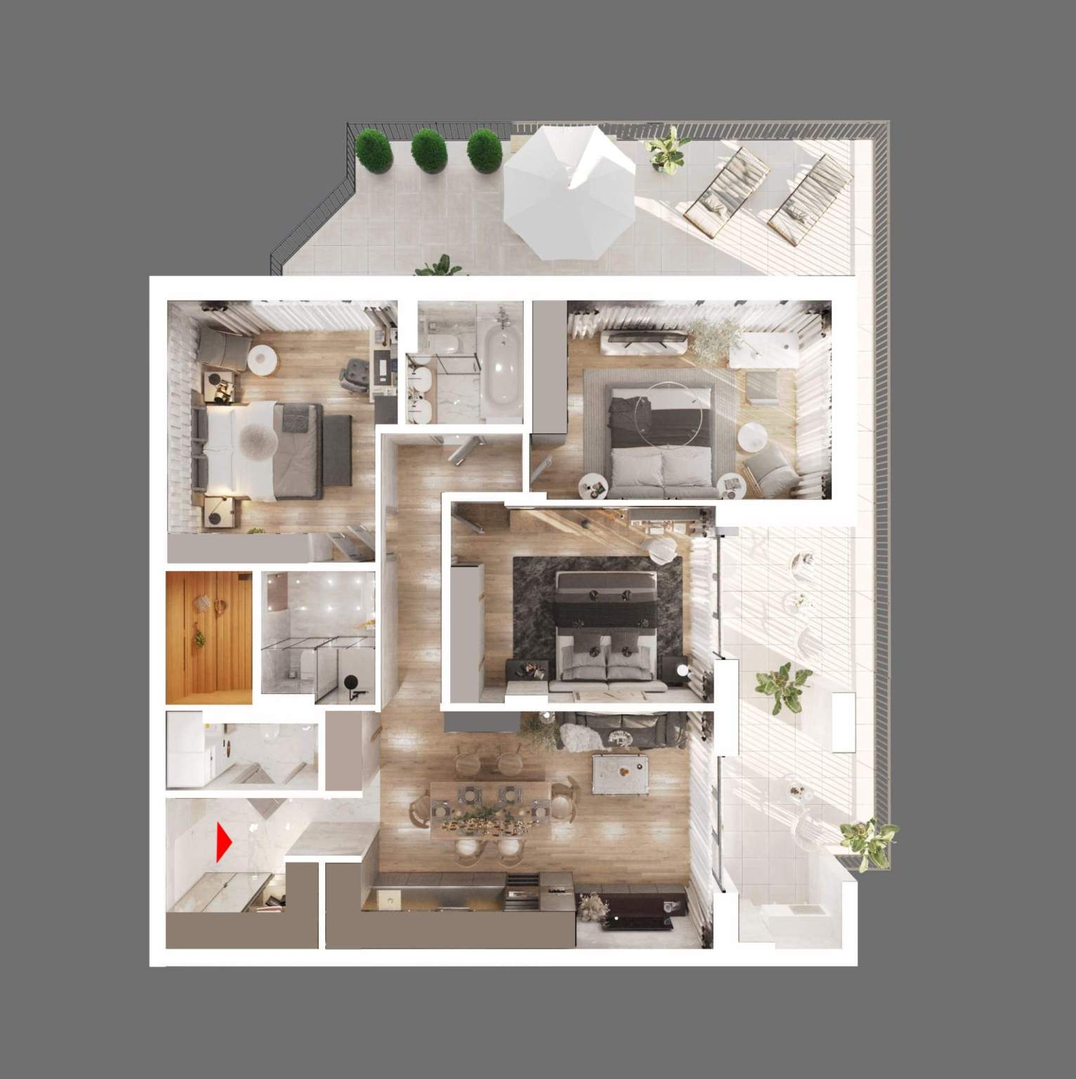 Каждая квартира отличается особыми преимуществами и подготовлена к системе умный дом: - Панорамные окна от потолка до пола;- Собственная терраса;- Мастер спальня;- Гардеробная;- Баня в квартире (! ) - Дополнительная, сверхнормативная шумо/гидроизоляция стен и перекрытий- Индивидуальная приточно-вытяжная вентиляция с фильтрацией и рекуперацией